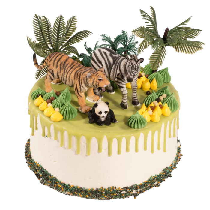Deze taart brengt de wildernis tot leven met stoere tijgers, grappige panda’s, nieuwsgierige zebra’s en tropische palmbomen. Of het nu gaat om een verjaardag of een avontuurlijk feestje, deze taart zorgt gegarandeerd voor een brul van enthousiasme!