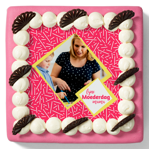 Luchtige cake, verse slagroom, een laagje jam en mooie roze marsepein is de basis van deze heerlijke taart. Verras je moeder met een leuke afbeelding die je waar je zelf je foto aan toe kan voegen.
