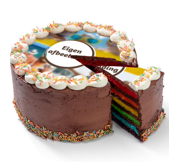 Deze opvallende taart bestaat uit lagen luchtige vanillecake in een regenboog van kleuren, tussen iedere laag is een fluweelzachte chocoladevulling te vinden. De buitenkant van de taart is bekleed met een romige chocoladecrème en versierd met vrolijke sprinkles en een feestelijke uitstraling.