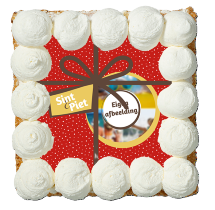 Een vrolijke slagroomtaart in Sint & Piet thema, versierd met royale toefjes verse slagroom en een feestelijke cadeau-opdruk. Deze taart kan volledig gepersonaliseerd worden met uw eigen logo, perfect voor bedrijven die hun medewerkers willen verrassen.