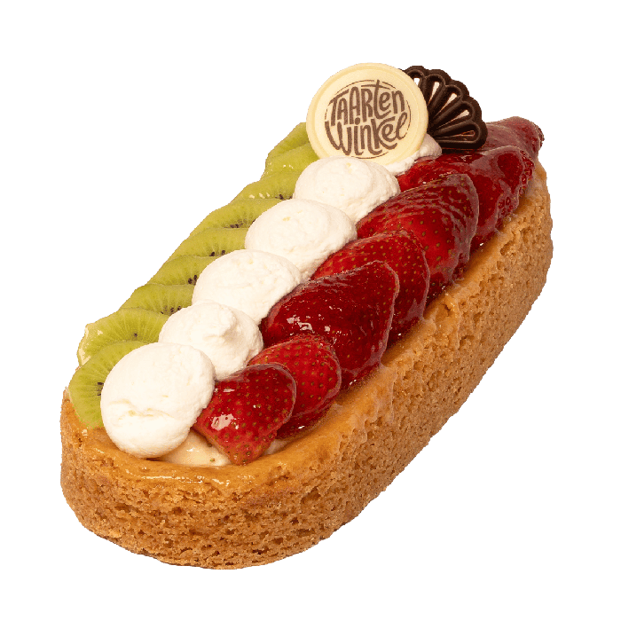 Geniet van deze heerlijke Fruit Slof, een echte blikvanger én smaakexplosie! De knapperige sloffenbodem is royaal gevuld met een zachte, romige laag gele room en prachtig afgetopt met een mix van vers fruit: smakelijke aardbeien en friszure kiwi.
